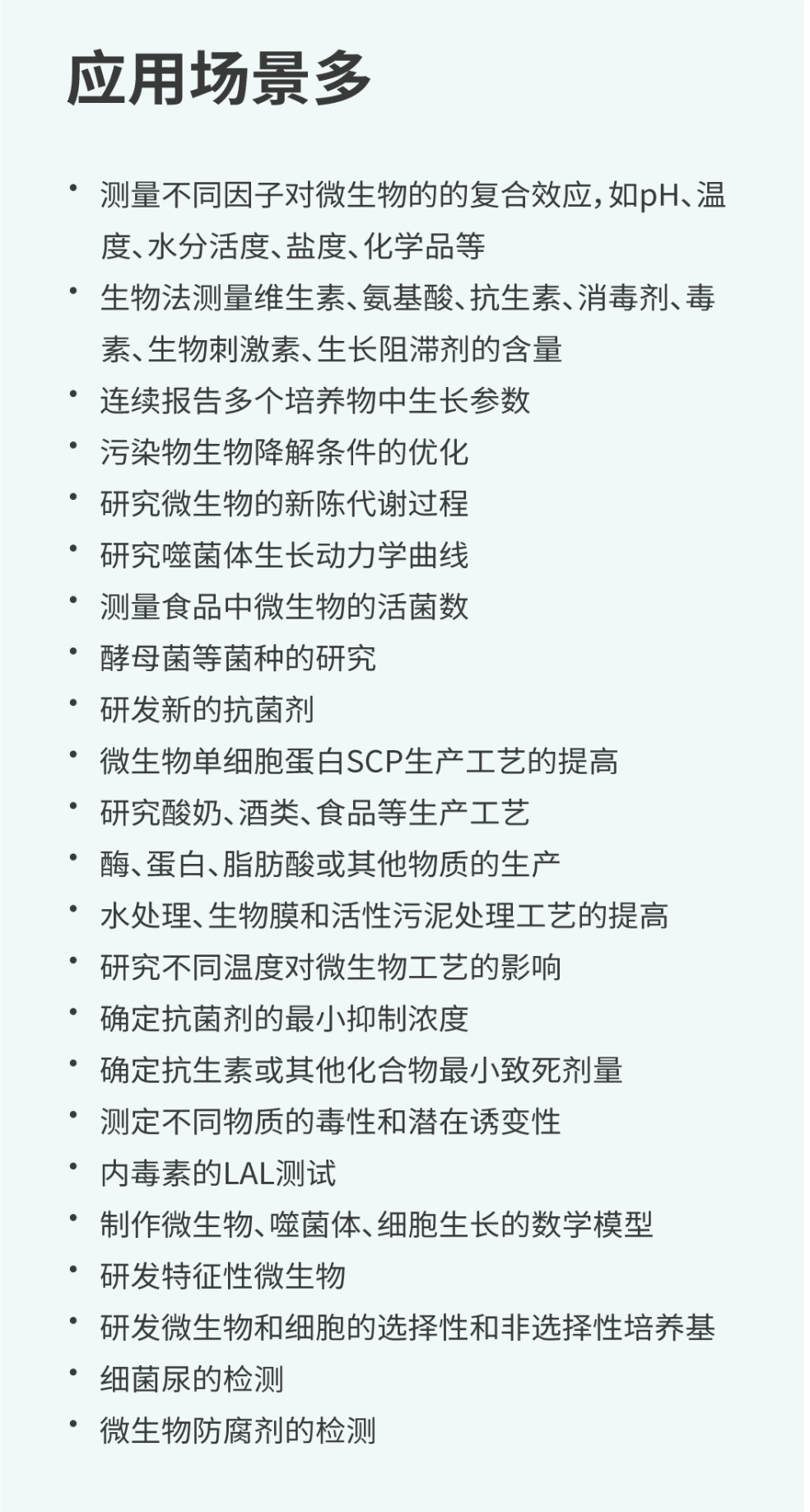 可實(shí)現(xiàn)多種微生物,包括細(xì)菌、真菌、酵母、噬菌體、變形蟲(chóng)和藻類等的在線監(jiān)測(cè)培養(yǎng)。