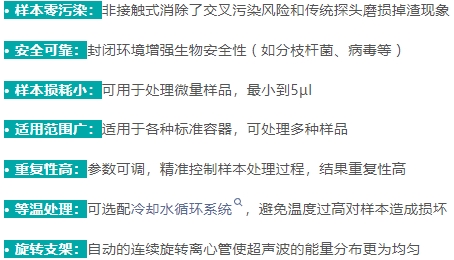 傳統(tǒng)的接觸式探頭超聲波粉碎機(jī),探頭與樣品直接接觸,有金屬離子污染,一次只能處理一個(gè)樣品,實(shí)驗(yàn)周期長(zhǎng);對(duì)于多個(gè)樣品,需要重復(fù)使用同一探頭,容易造成樣品交叉污染。由于每次探頭插入樣品的深度不同,每次超聲的能量分布也不盡相同,影響實(shí)驗(yàn)結(jié)果的重復(fù)性和準(zhǔn)確性。此外,由于不能采用封閉系統(tǒng),在超聲過(guò)程中產(chǎn)生的氣霧或者泡沫會(huì)擴(kuò)散到環(huán)境中,造成潛在的生物危險(xiǎn)。