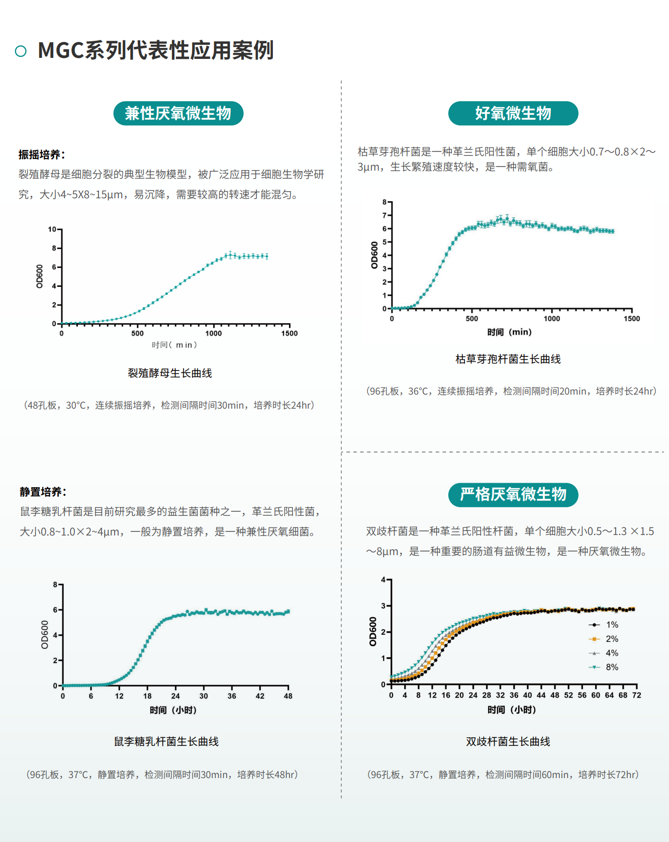MGC-500微生物生長曲線分析儀可以實現(xiàn)不同培養(yǎng)溫度、氣體環(huán)境、振搖狀態(tài)和光照組合下的微生物生長狀態(tài)實時檢測,而且整個過程無需人工頻繁取樣,也無需人員值守,大大降低了污染風(fēng)險,真正實現(xiàn)了人力的解放和研究效率的提升。