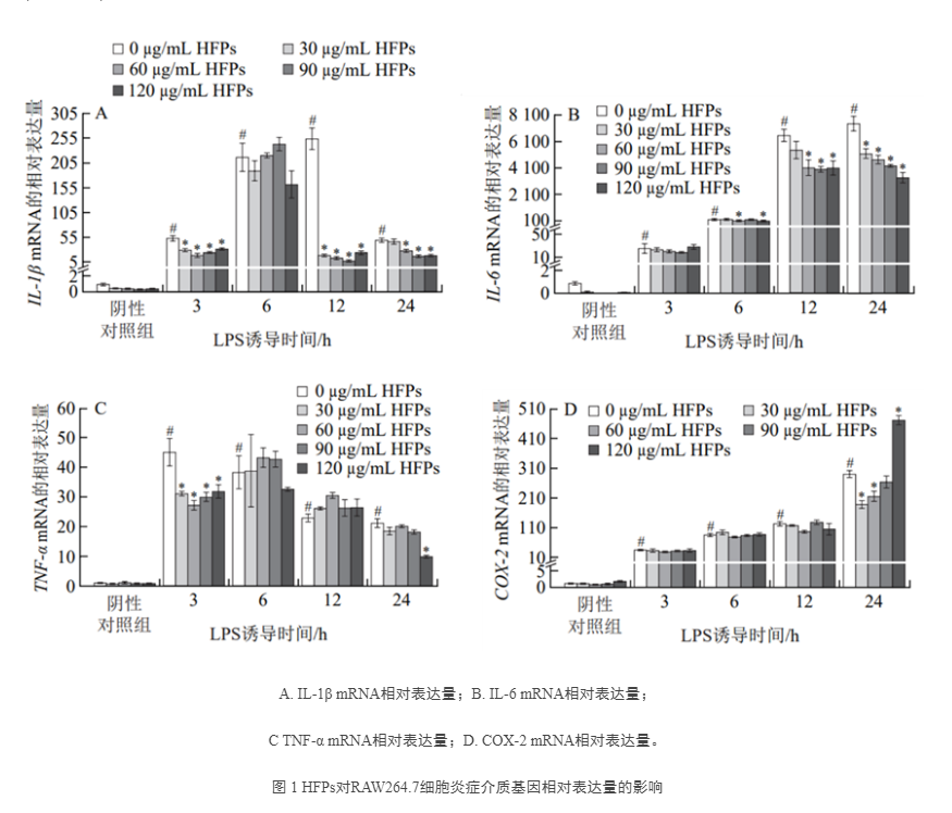 采?實時熒光定量PCR測定HFPs對LPS誘導的巨噬細胞中重要促炎細胞因?IL-1β、IL-6和接觸式超聲在胞內蛋?及核酸提取過程中的應?TNF-α基因相對表達量,以及炎癥相關酶COX-2基因相對表達量的影響。如圖1所?,LPS刺激不同時間后,所有炎癥介質的mRNA表達?平均顯著提?(P<0.05)。HFPs對促炎細胞因?的抑制作?與其劑量、LPS誘導時間及細胞因?種類相關。與LPS組相?,靜息狀態(tài)細胞經(jīng)HFPs處理再經(jīng)LPS誘導12、24 h后,IL-1β和IL-6的基因相對表達量顯著下降;HFPs顯著抑制LPS誘導3 h后TNF-α基因的相對表達,?在LPS誘導6?24 h的抑制作?總體不明顯。在LPS誘導24 h,較低劑量HFPs(30、60 μg/mL)預處理對COX-2基因表達具有顯著抑制作?,但提?劑量后該抑制效果消失,甚?出現(xiàn)反向促進作?,120 μg/mL HFPs預處理促使COX-2相對表達量較LPS組顯著上升(P<0.05)。