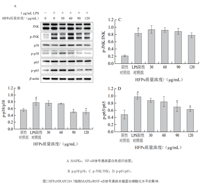 采?蛋?免疫印跡法測定巨噬細胞中MAPKs和NF-κB信號通路關鍵蛋?的磷酸化?平。如圖2所?,與陰性對照組相?,LPS刺激3 h后細胞中p38、JNK和p65蛋?的磷酸化?平顯著升?(P<0.05)。90、120 μg/mL HFPs預處理對LPS誘導的巨噬細胞中p38和p65的磷酸化產(chǎn)?顯著抑制作?(P<0.05),且呈?定的劑量依賴性,但對JNK的磷酸化沒有顯著影響,表明HFPs的抗炎作?可能與其靶向作?于p38 MAPK和NF-κB p65有關。