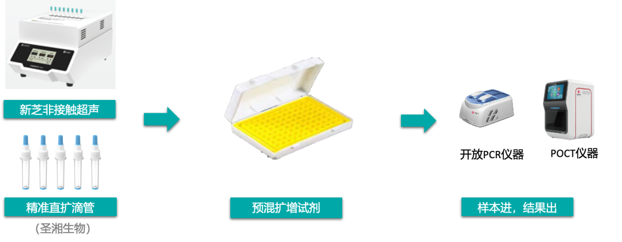 超聲直擴(kuò)技術(shù),是一種利用超聲波,加速呼吸道待檢樣本裂解釋放,提升檢測(cè)效率及準(zhǔn)確性的前處理方式。相較傳統(tǒng)磁珠法,超聲直擴(kuò)技術(shù)從樣品采集到上機(jī)擴(kuò)增,能夠有效減少繁瑣移液步驟,整個(gè)前處理過程僅需120s,極大縮短樣本處理時(shí)間,實(shí)驗(yàn)結(jié)果滿足檢測(cè)標(biāo)準(zhǔn)。此外,據(jù)粗略測(cè)算,在10000份樣本檢測(cè)情況下,檢測(cè)成本可下降約50%,極大提升呼吸道檢測(cè)效率,有效降低檢測(cè)成本,讓檢測(cè)方式更快、更準(zhǔn)、更簡單。