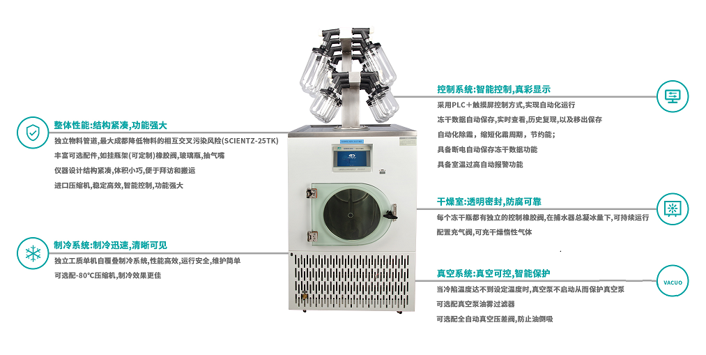 ? 制冷系統(tǒng):制冷迅速,清晰可見 · 獨(dú)立工質(zhì)單機(jī)自復(fù)疊制冷系統(tǒng),性能高效,運(yùn)行安全,維護(hù)簡(jiǎn)單 · 可選配-80℃壓縮機(jī),制冷效果更佳 | ? 燥室:透明密封,防腐可靠 · 每個(gè)凍干瓶都有獨(dú)立的控制橡膠閥,在捕水器總冰量下,可持續(xù)運(yùn)行 · 配置充氣閥,可充干燥惰性氣體 |