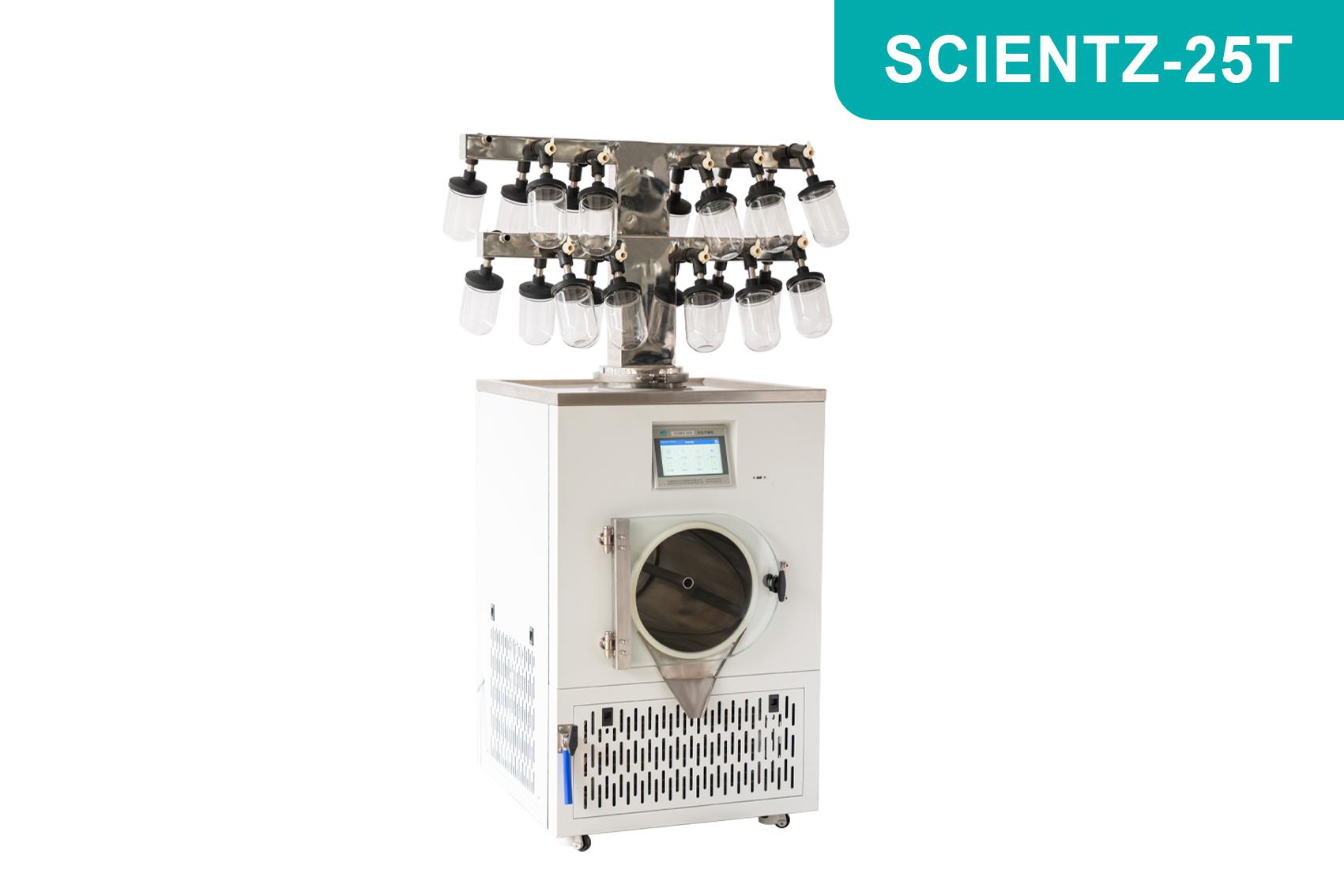 SCIENTZ-25T T型架型冷凍干燥機(jī)標(biāo)配24只橡膠密封閥,可掛廣口瓶24只、或茄型瓶24只。緊湊的儀器結(jié)構(gòu)設(shè)計(jì),可有效節(jié)省寶貴的實(shí)驗(yàn)室空間。本機(jī)采用先進(jìn)的進(jìn)口壓縮機(jī),功能強(qiáng)大,可提供高度自動(dòng)化的高品質(zhì)冷凍干燥環(huán)境(常規(guī)空載-56℃,可選配-80℃壓縮機(jī)),適用于對(duì)細(xì)菌、真菌、多肽樣品、微生物菌種的保藏等樣品的處理。