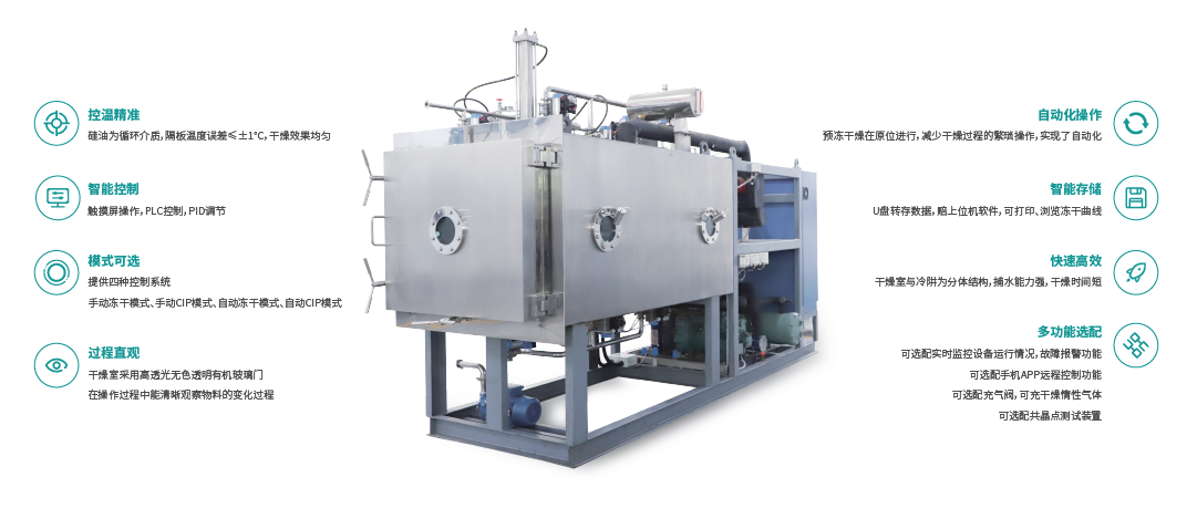 ? 多功能選配 可選配實時監(jiān)控設備運行情況,故障報警功能 可選配手機APP遠程控制功能 可選配充氣閥,可充干燥惰性氣體 可選配共晶點測試裝置 | ? 過程直觀 采用高透光有機玻璃門,能清晰觀察物料的變化過程 |