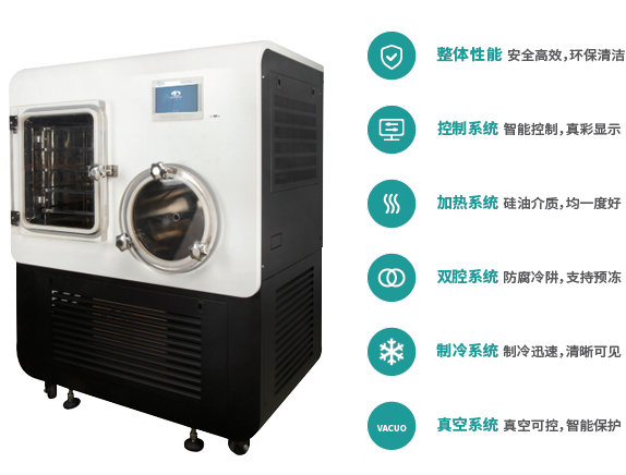 ? 進口真空泵 | ? 自動充氮接口 | ? T型掛瓶架 | ? 共晶點測試 | ? 手機APP遠程控制 | |