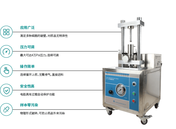 ? 應(yīng)用廣泛 滿足多種細胞的破壁,對樣品無特異性 | ? 壓力可調(diào) 最大可達40000 PSI壓力,連續(xù)可調(diào) |