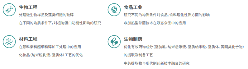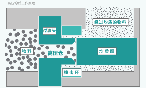 物料由物料杯經(jīng)單向閥進(jìn)入高壓倉(cāng),通過(guò)柱塞伸縮加壓使樣品達(dá)到所調(diào)節(jié)控制的高壓下,通過(guò)特定寬度的限流縫隙瞬間釋放形成微射流撞擊沖擊閥或均質(zhì)閥上,依次經(jīng)過(guò)空穴、撞擊、剪切的作用來(lái)達(dá)到物料的乳化分散和細(xì)胞粉碎機(jī)的目的。