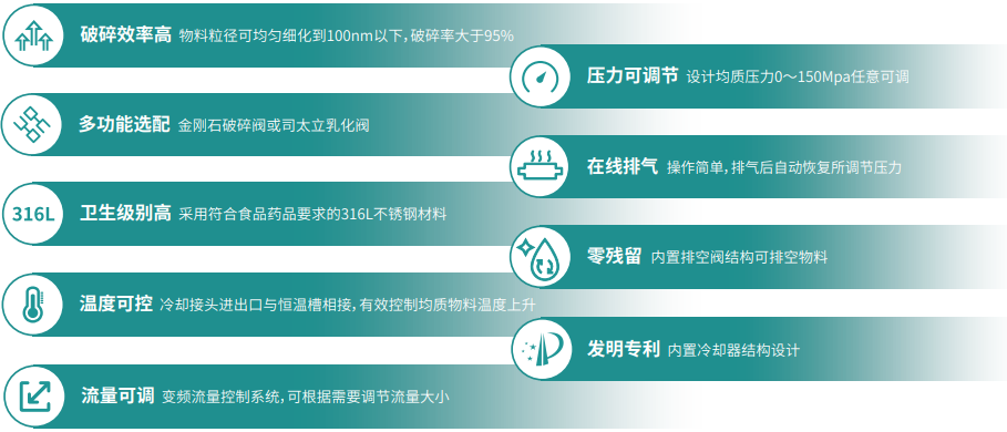 ? 壓力可調(diào)節(jié) 設(shè)計(jì)均質(zhì)壓力0~150bar任意可調(diào) | ? 溫度可控 冷卻接頭進(jìn)出口與恒溫槽相接,有效控制均質(zhì)物料溫度上升 |