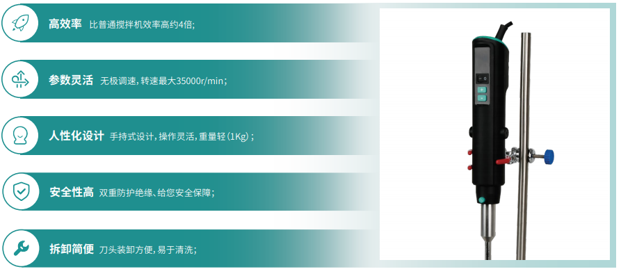 ? 高效率 比普通攪拌機效率高約4倍 | ? 參數(shù)靈活 無極調(diào)速,轉(zhuǎn)速最大35000rpm |