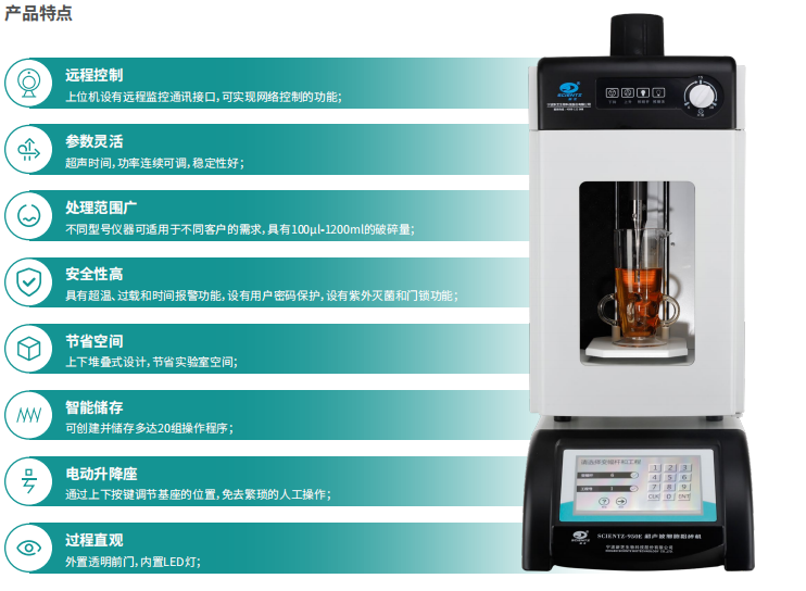 智能型超聲波細(xì)胞粉碎機(jī)可實(shí)現(xiàn)網(wǎng)絡(luò)控制符合現(xiàn)代人性化設(shè)計(jì)理念。為提高生物環(huán)境的安全性,本產(chǎn)品增加紫外殺菌功能,降低了人員感染和樣本交叉污染的風(fēng)險(xiǎn)。它可用于不同容量樣本(依據(jù)不同體積選擇對(duì)應(yīng)型號(hào)及探頭)的處理,廣泛應(yīng)用于生命科學(xué)、制藥和材料化學(xué)等領(lǐng)域樣品的裂解、乳化、均質(zhì)、破碎。 另外可用于中草