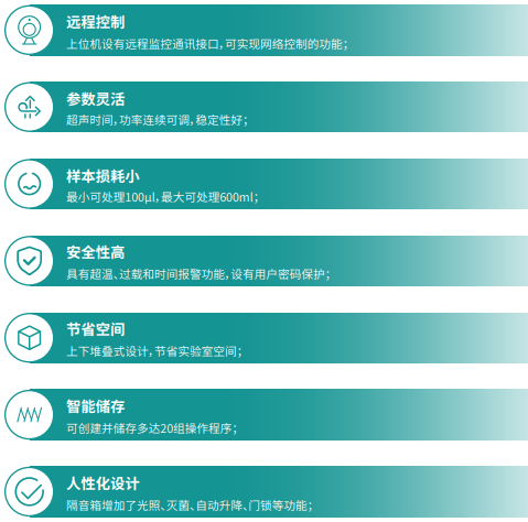 ? 參數(shù)靈活 超聲時(shí)間,功率連續(xù)可調(diào),穩(wěn)定性好 | |