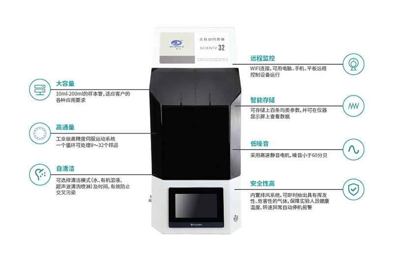 ? 大容量 10ml-200ml的樣本管,適應(yīng)客戶的 各種應(yīng)用 ? 低噪音 采用高速靜音電機(jī),噪音小于60分貝 ? 高通量 工業(yè)級高精度伺服運(yùn)動系統(tǒng) 一個循環(huán)可處理8~32個樣品 ? 遠(yuǎn)程監(jiān)控 WiFi連接,可用電腦、手機(jī)、平板遠(yuǎn)程 控制設(shè)備運(yùn)行 ? 智能存儲 可存儲上百條均質(zhì)參數(shù),并可在儀器 顯示屏上查看數(shù)據(jù) ? 自清潔 可選擇清潔模式(水、有機(jī)溶液、 超聲波清洗噴淋)及時間,有效防止 交叉污染 ? 安全性高 內(nèi)置排風(fēng)系統(tǒng),可即時抽出具有揮發(fā) 性、危害性的氣體,保障實(shí)驗(yàn)人員健康 溫度、轉(zhuǎn)速異常自動停機(jī)報警 |