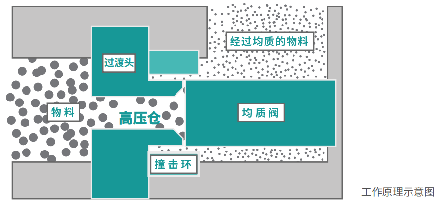物料由物料杯經(jīng)單向閥進(jìn)入高壓倉(cāng),通過(guò)柱塞伸縮加壓使樣品達(dá)到所調(diào)節(jié)控制的高壓下,通過(guò)特定寬度的限流縫隙瞬間釋放形成微射流撞擊沖擊閥或均質(zhì)閥上,依次經(jīng)過(guò)空穴、撞擊、剪切的作用來(lái)達(dá)到物料的乳化分散和細(xì)胞粉碎機(jī)的目的。