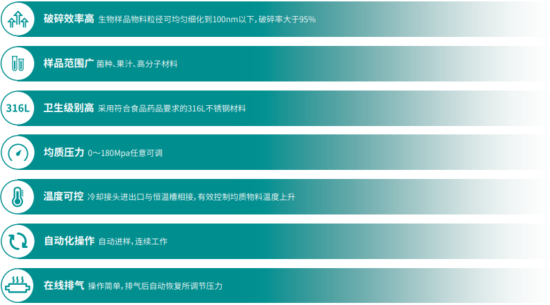 ? 樣品范圍廣 菌種、果汁、高分子材料 | ? 破碎效率高 物料粒徑可均勻細(xì)化到100nm以下,破碎率大于95% |